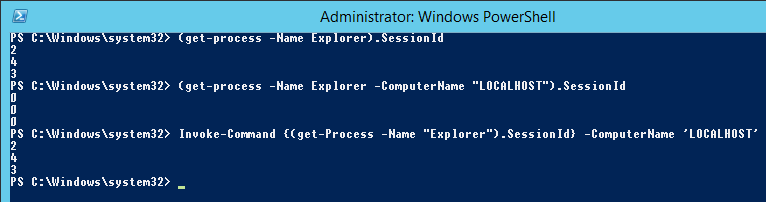 Invoke-Command {(get-Process -Name "Explorer").SessionId} -ComputerName 'LOCALHOST'
