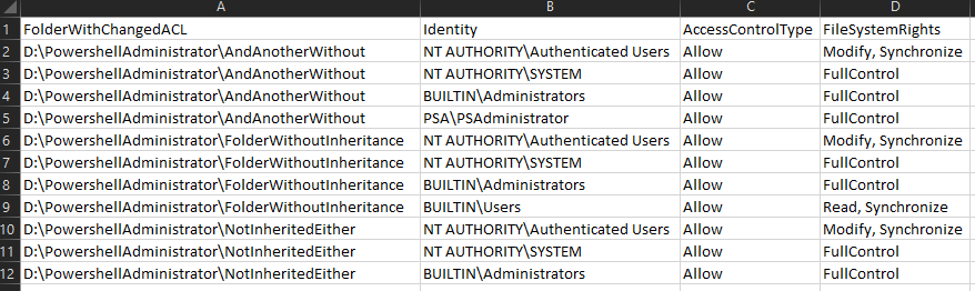 And in the end I want to export the information and set my own delimiter (as we have several servers with US and several with EU notation, but I want Excel to treat them all the same and be able to open all the files without the need to use the text to columns feature). Otherwise the -UseCulture switch could have been used, so the OS determines which delimiter should be used.$DirectoryListWithChangedACL | Export-Csv $ExportFile -Delimiter $CSVDelimiter -NoTypeInformation