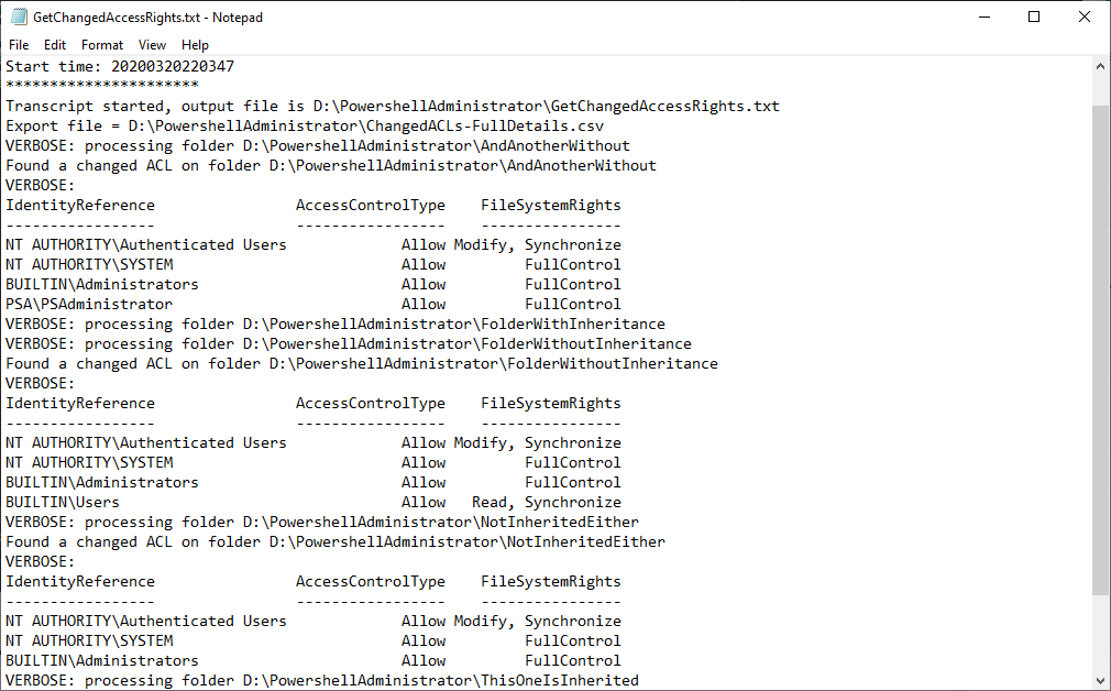 In that case it’ll show a summary of the folders it has encountered, where ACL inheritance is disabled and it’ll log this in a log file and export the information to a CSV. If you add -Verbose, it’ll add more information to the log file and the -FullDetails switch will export all access rights for each folder and each user as well.
